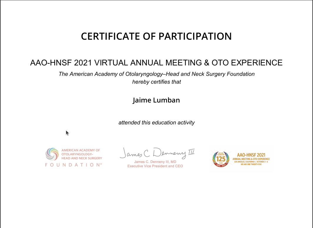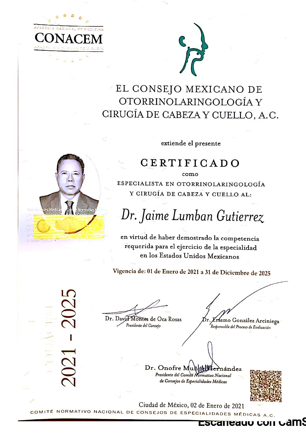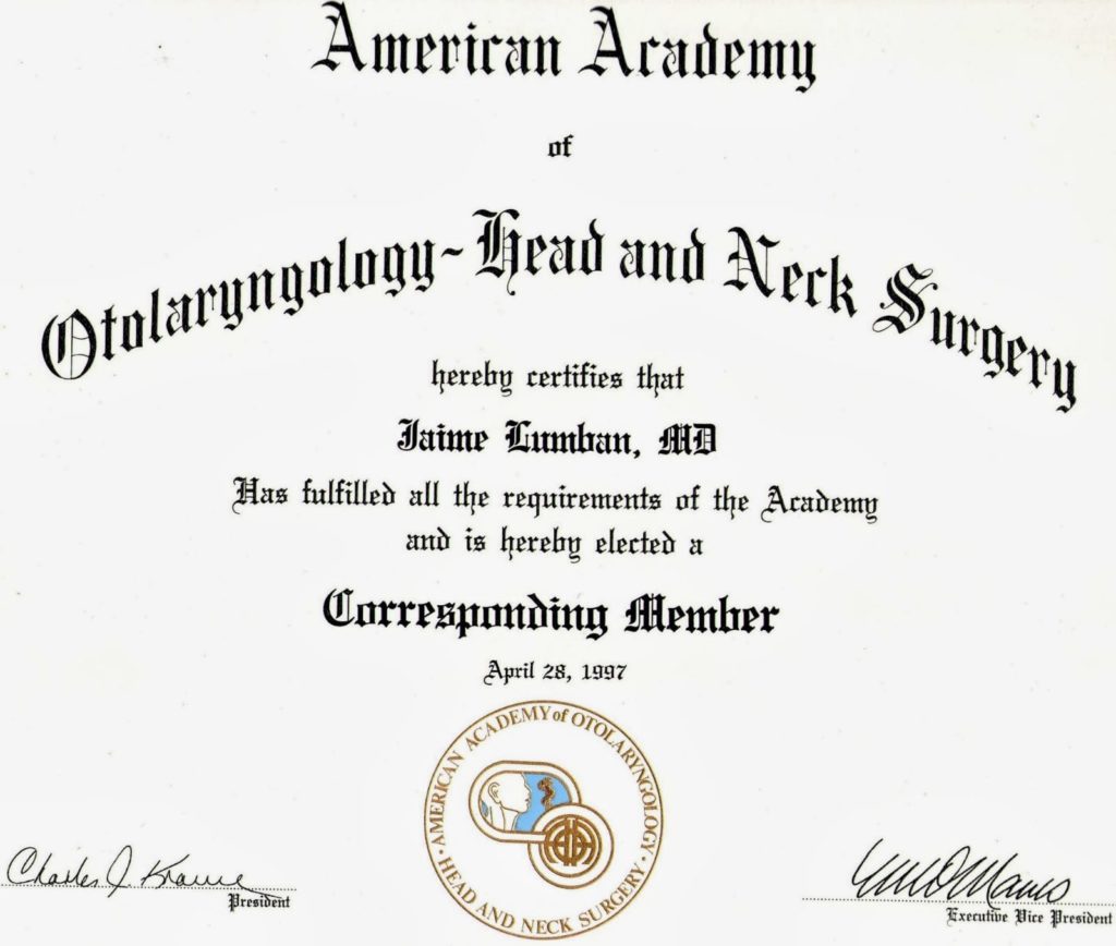 Especialista certificado en oídos, nariz y garganta